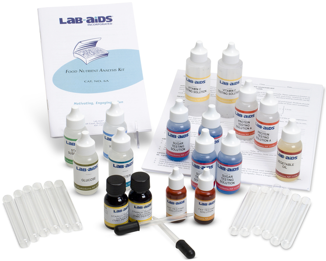 IncludesTeacher's guide with MSDS, 30 Student Worksheets and Guides, Drop control bottle of Glucose, Vitamin C, Protein, Starch Suspension, Vegetable Oil, 2 Fat Testing Solution, 2 Protein Testing Solution A and B, 2 Sugar Testing Solution, 2 Vitamin C Testing Solution, 2 Bottles of Starch Testing solution, 30 Test tubes